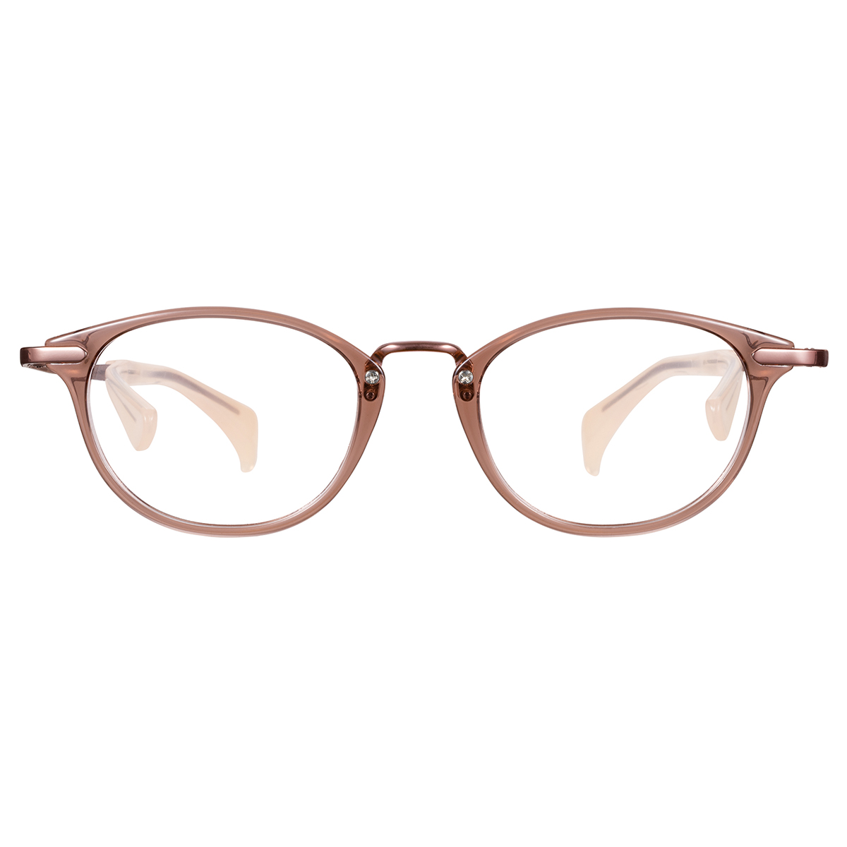 透明感ある樹脂フロントとメタルブリッジが程よくトレンドを感じさせるコンビネーションフレーム。
