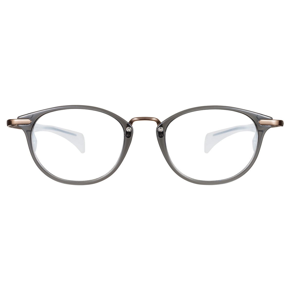透明感ある樹脂フロントとメタルブリッジが程よくトレンドを感じさせるコンビネーションフレーム。