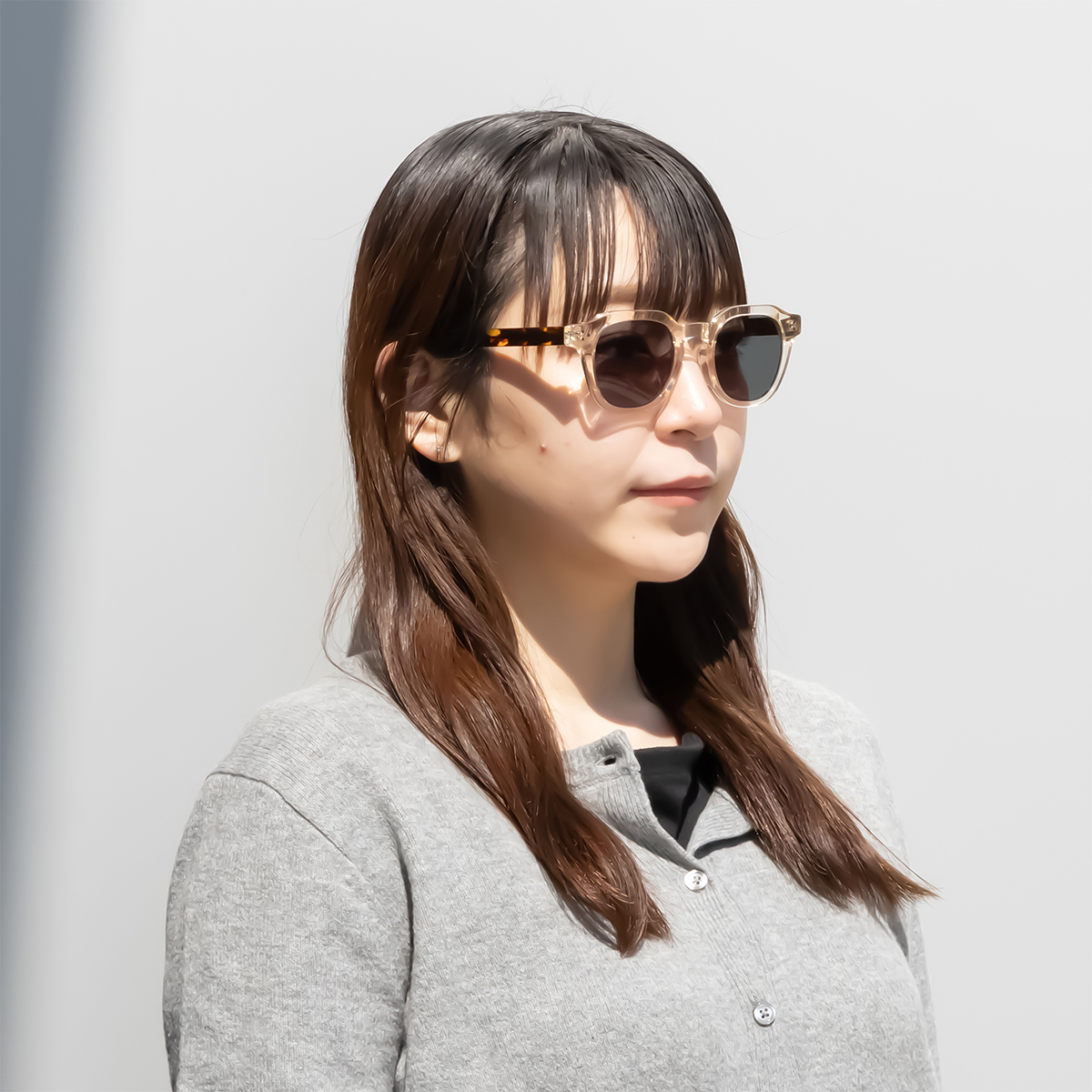 丸みを抑えた直線的なカッティングが、顔立ちにシャープな知性とモードなスパイスをプラスします。