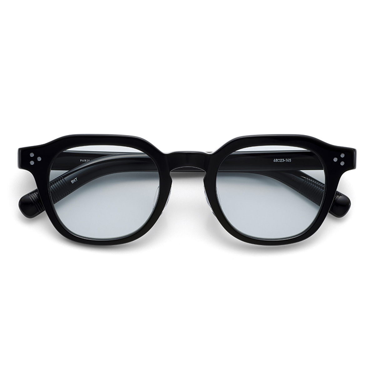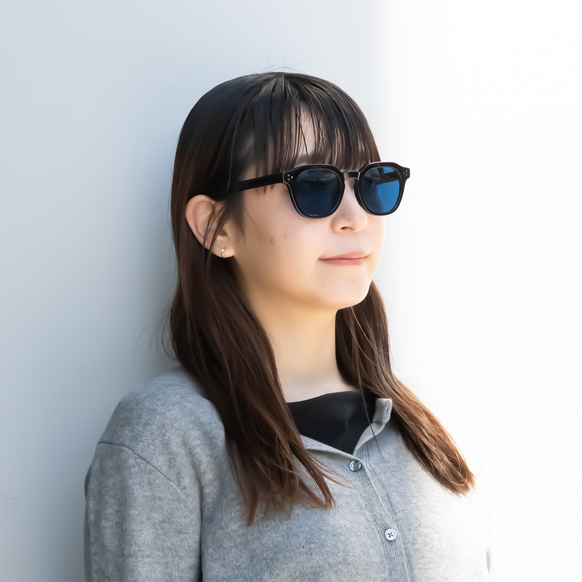 室内ではライトブルーのファッショナブルなメガネとして、屋外では深みのあるブルーカラーへ変化。