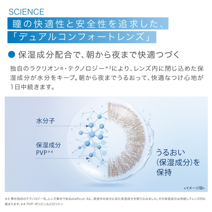 レンズ内に閉じ込めた保湿成分が水分をキープ。朝から夜までうるおって、快適なつけ心地が一日中続きます。